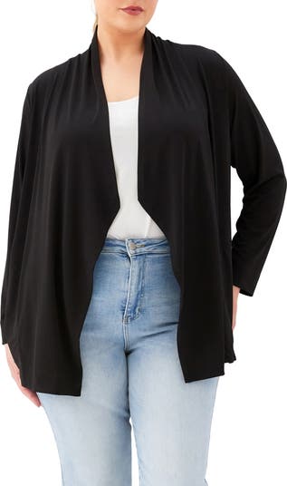 Wrinkle-resistant jersey fabric brings a travel-friendly look to this open-front cardigan designed with a layer-friendly fit.
