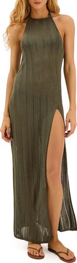 Airy open-stitch stripes and a soaring front slit lend beach-siren allure to this cover-up maxi dress topped with a flirty halter neck.