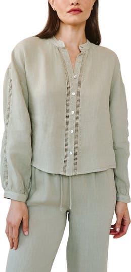 Cut from lightweight linen, this blousy front-button top is accented with airy open stitching and framed by dropped shoulder for a relaxed fit.