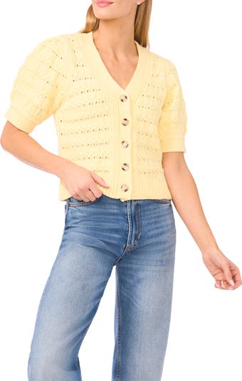 Delightful puff sleeves sweeten the silhouette of this cotton-blend cardigan knit with airy open stitching.