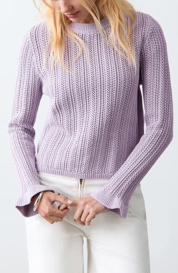 Airy open stitching and sweetly ruffled cuffs define this cozy crewneck sweater knit from soft cotton yarns.