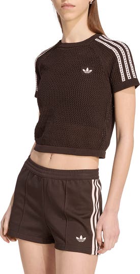 Keep your look sporty and fashion-forward in a trim and abbreviated sweater knit in an airy, open-stitched design for a crocheted look.