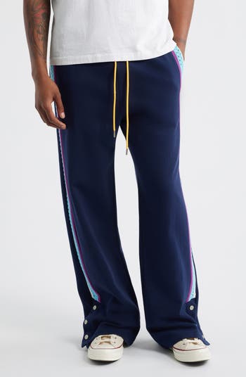 Crochet-inspired stitchwork brings homespun vibes to athleisure pants finished with snap cuffs to customize the look.