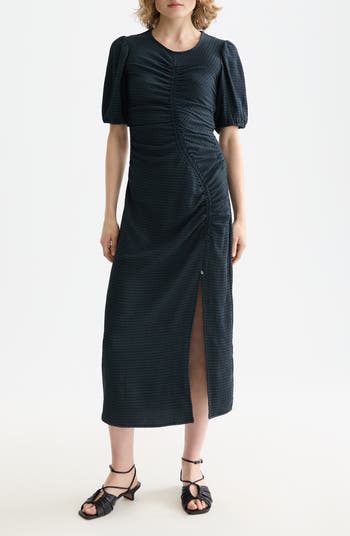 Gathering along curved lines creates dimensional movement in a cotton-kissed midi dress framed with short puff sleeves.