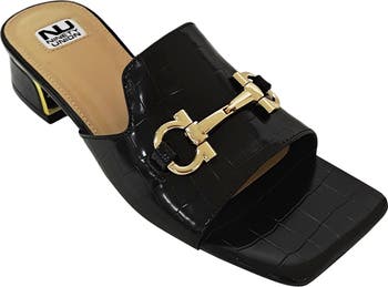 Dress it up with our square-toe, wide-banded slide. Link ornament detail, faux-croc embossed upper and geometric block heel.