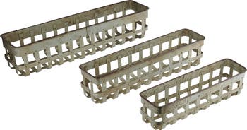 This set of three open-weave metal baskets adds style and functionality to any home. These baskets feature an open weave design that creates a modern and airy look in any space. The metal construction is sturdy and durable, with a silver finish that resists rust and corrosion. The baskets come in three different sizes that can fit in various spaces. Measures 16 inches in length, 5.5 inches in width, and 5 inches in height for the small basket, 20 inches in length, 5.5 inches in width, and 5 inches in height for the medium basket, and 24 inches in length, 5.5 inches in width, and 5 inches in height for the large basket. The baskets can store and display various items such as fruits, vegetables, bread, magazines, books, or towels. Use them in the kitchen, living room, bathroom, or bedroom. Whether for organizing items or adding some flair to the home décor, this set of three open-weave metal baskets is a great choice.