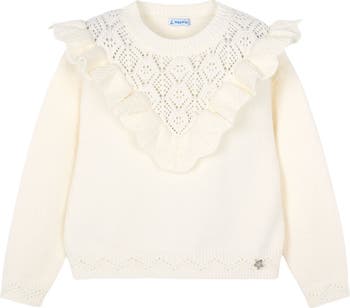 Contains recycled polyester. Long sleeved Sweater for girls. Round neckline. Knitted fabric, soft and pleasant to the touch. Decorative elements: openwork details, decorative ruffle.