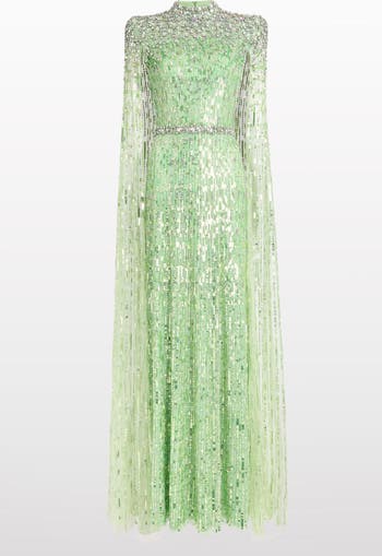 Commanding yet graceful, this gown features structured shoulders and a flowing cape that drapes effortlessly to the floor. The fitted silhouette and intricate embellishment add a sense of opulence and modern drama. A captivating option for high-profile galas or formal red-carpet events.