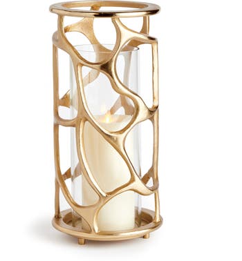 - With a hand-sculpted meandering design, you'd never guess this artisan hurricane is made of a sturdy cast aluminum. With a matte gold finish and glass cylinder, it is sure to dress up any modern space. Interior use. Clean with damp cloth. Avoid chemicals that may be harmful to finish. Never leave a burning candle unattended. Use only LED flameless candles when specified.