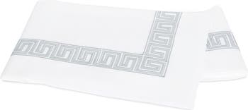 Greek-key embroidery inspired by an intricately beaded Schumacher tape adds an elegant flourish to this flat sheet cut from silky cotton percale.