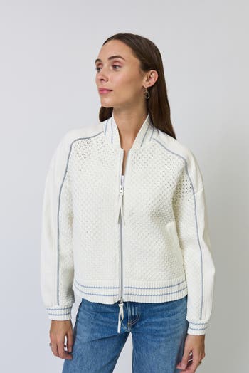 This bomber jacket blends a textured knit body with smooth sleeves, finished with contrast piping and ribbed trim for a sporty shape that layers easily through every season.