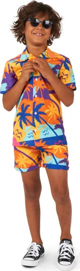 Lightweight and ready for fun, this camp shirt covered in palm trees pairs with matching shorts to keep your kid comfortable and easy to see indoors and out.
