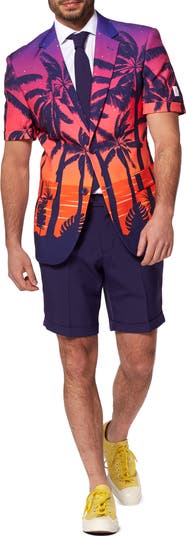 Fiery sunsets and shadowy palm trees inspire the brilliance of a short-sleeve sport coat that pairs with a dark tie and shorts for a bold, resort-ready look.