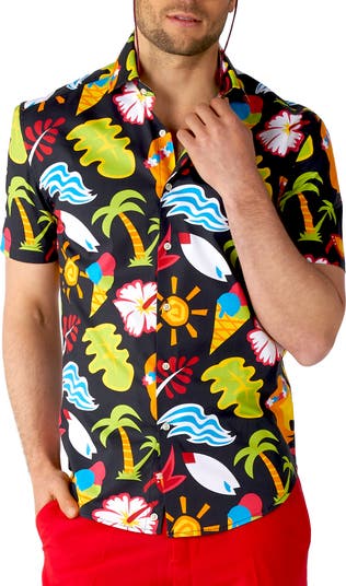 Palm trees, surfboards and tropical blooms invite sunny-day breezes in a shirt cut from crisp, cool cotton with a touch of stretch to keep you moving.