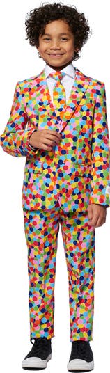 He can bring the party with him wherever he goes in a confetti-inspired suit featuring a trim-fit jacket, trousers and coordinating clip-on tie.