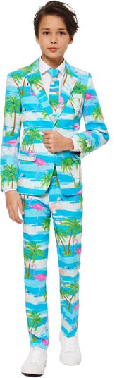 This bright palm and flamingo-print two-piece suit redefines formal style with fresh, bold personality. Tailored for a modern fit, it includes a two-button suit jacket, trousers and a matching tie to pull the whole outfit together.