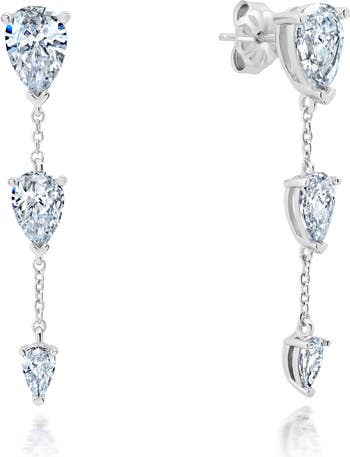 Trios of hand-set cubic zirconia glow along these linear drop earrings crafted from sterling silver.