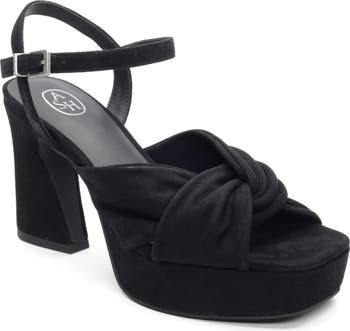 A knotted design brings subtle drama to the vamp of this square-toe suede platform sandal lifted by a lofty block heel and secured with an adjustable ankle strap.