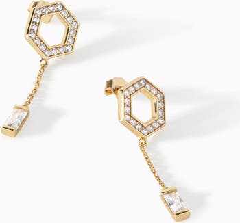 Let your confidence shine through your eyes and on your ears in the Tyra drop baguette earrings. Featuring a dazzling baguette stone, elegantly suspended from our signature CZ-encrusted hexagon shaped stud, connected by a delicate yet unyielding chain, ensuring that these remarkable earrings gracefully sway with your every move.
