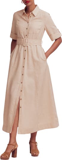 This breezy shirt dress is crafted from a lightweight linen-cotton blend that breathes through hot commutes and chilly office A/C. A classic collar, chest pockets and roll-up short sleeves lend a subtle utilitarian edge, while the detachable self belt defines the waist for a pretty fit-and-flare shape. An ankle-grazing hem and side-seam pockets complete the effortless look.