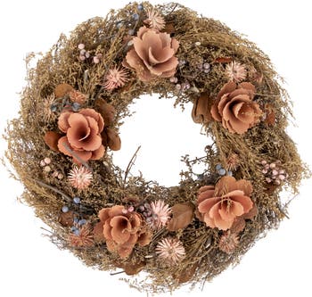 Capture the feeling of a crisp fall day with this beautiful autumn wreath. It features orange leaves with a brown twig backing, that will give a pop of color to your home décor. Display this vibrant wreath on doors or over your mantle. Product Features: Artificial fall harvest twig wreath Designed with coral pink flowers and orange leaves Accented with a variety of blue and pink berries Foam backing for hanging No assembly required - wreath comes in 1 piece Recommended for indoor use - if using outdoors place under a covered area Dimensions: 13.75” diameter (measured from outermost edge to outermost edge across the wreath) Inner ring dimensions: " Material(s): plastic/wood/foam/leaves