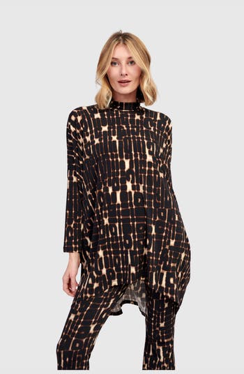 Soft and sculptural, this oversized tunic top flows from a mock neck into a swingy, rounded hem. The matte jersey offers gentle stretch and drapes beautifully under the arms for ease in motion. A true comfort piece with elevated shape.