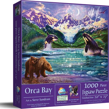 Orca Bay 1000 pc Jigsaw Puzzle by SunsOut - 1000 Piece Jigsaw Puzzle - Completed Size: 20" x 27" - Puzzle Artist: Steve Sundram - Interlocking Pieces and Durable Construction: SunsOut jigsaw puzzles feature interlocking pieces that fit securely, making assembly easier and reducing frustration. -Ages: 15 years and older - Perfect for adults and seniors. SunsOut puzzles ensure high manufacturing standards ensuring their commitment to quality and customer service. - SunsOut puzzles use soy based inks, high quality puzzle board. As this is a jigsaw puzzle: assembly is required and batteries are not required.
