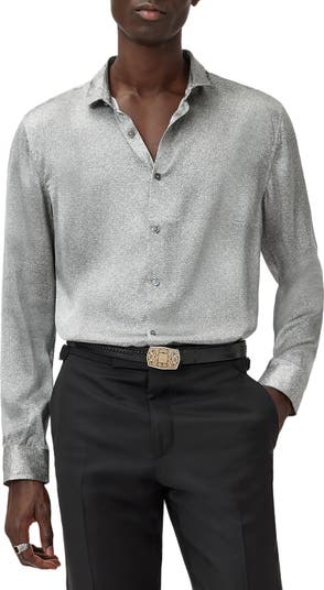 From a distance the pattern of this silk button-up has a fine texture with cool depth and dimension but get close to it and it reveals is smooth, drapey nature.