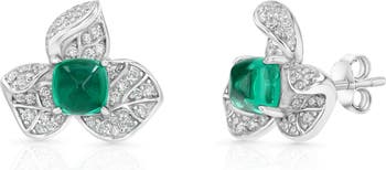 A graceful blend of elegance and brilliance, this exquisite earring design features a vivid emerald green stone framed by delicately sculpted pave-set petals. Crafted in luminous white gold, each curve catches the light beautifully, creating a refined sparkle that feels both timeless and modern. The rich green center stone adds a bold yet sophisticated pop of color, while the surrounding pavé cz diamonds enhance its depth and radiance. Effortlessly elegant, this piece is designed to elevate everyday wear and make a subtle statement on special occasions alike