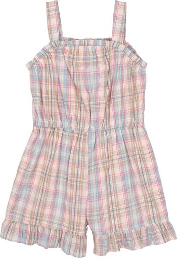 - This stylish girl's romper features a delightful pastel plaid pattern with shades of pink, blue, yellow, and green. Designed with shoulder straps and a cinched waist for a comfortable fit, it also has ruffled hem details that add a playful touch. Perfect for warm weather, this romper is ideal for casual outings and playtime. Fabric Care 100% COTTON / 100% POLYESTER