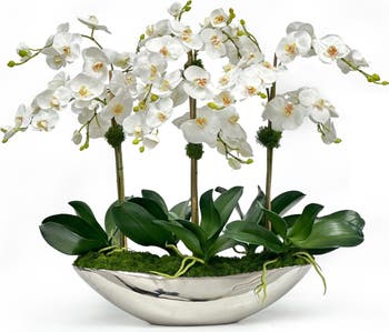 Graceful, sculptural, and impossibly chic — this floral accent brings a quiet sophistication to any space. Set in a gleaming silver vessel, the soft curves of each bloom rise with poise and elegance, creating a striking contrast against the minimalist metallic base.