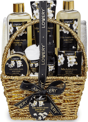 Deluxe 9 piece set - this spa gift basket has everything a woman needs! It includes shower gel, bubble bath, body lotion, bath salt, body scrub, bath oil, a bath towel and a loofah back scrubber. Packed in a stunningly wrapped gold wire basket, it also has a gift note card for you to personalize it.