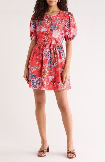 A drawstring at the waist cinches the silhouette of this crisp cotton minidress framed by pretty puff sleeve and covered in a gorgeous floral print.