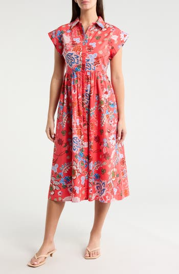 A vibrant garden of blooms brings a dose of sweetness to a shirtdress made from pure, breathable cotton for a comfortable fit even as the temp rises.