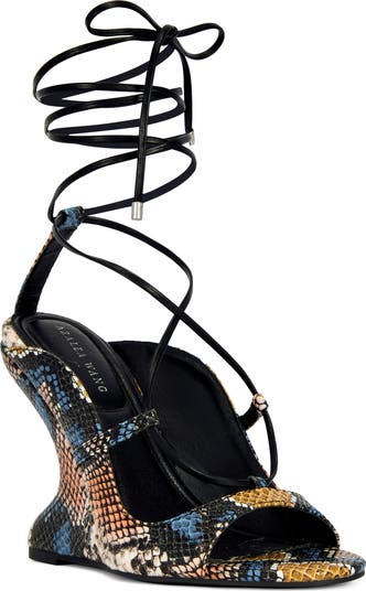 Slither into the spotlight in this head-turning snakeskin-print sandal fastened with wraparound ankle ties and lifted on a sculptural wedge heel. Perfect for nights out, rooftop parties and street style, this multicolor wedge sandal delivers an edgy, high-fashion vibe and runway-inspired design.