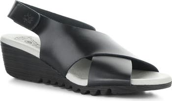 Wide, crisscrossing straps create striking dimension on a slingback leather sandal grounded by a cushioned footbed and modest wedge heel.