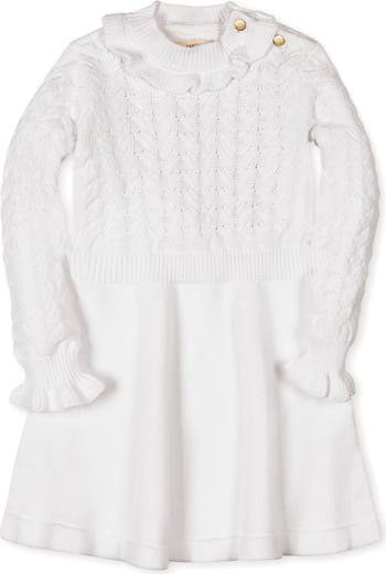 This beautiful piece combines the polish of a dress with the comfort of her favorite sweater (aka the best of both worlds). Features a cozy mock neck, ruffle details at the collar and cuffs, gold buttons at the shoulder, and a chunky cable design at the bodice and sleeves. A special piece in soft organic cotton she will treasure.