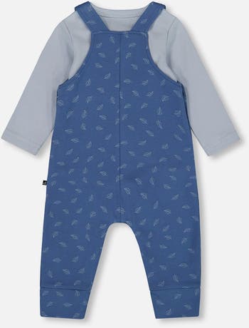 Our Organic Cotton Bodysuit and Overalls Set Blue and Leaf Print is perfect for your little adventurer. The overalls feature slanted pockets, a small patch pocket on the chest, folded cuffs and bottom snaps for easy diaper changes. The adjustable straps with buttons make dressing a breeze, and the overall’s relaxed fit ensures comfort throughout the day. The soft Bodysuit underneath features a wrap-over collar, two bears on the chest, long sleeves, and bottom snaps for quick changes. Made from a blend of organic cotton and elastane, this set is as cozy as it is cute, perfect for playtime or nap time.