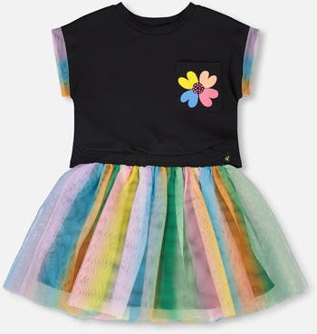 The bi-material dress in black brings a fun twist to everyday wear with its playful mix of textures. This short-sleeve dress combines a soft organic cotton jersey top with a rainbow-hued mesh skirt and features a round neckline, rainbow-colored sleeve borders and a small flower detail on the chest pocket. Made from a blend of breathable organic cotton with a polyester mesh skirt and lining, it ensures comfort and flair for every adventure.Sizes 2 and 3 years are designed without detachable 3D embellishments to ensure young children’s safety.