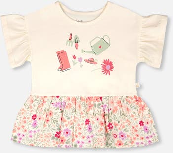 Our organic cotton bi-material tunic beige with flowers print is a charming piece full of playful details. This top features flutter sleeves, a round neckline, and a solid beige jersey top with garden-inspired motifs, contrasted by a flared muslin hem in an allover floral print. Light and comfortable, it’s a perfect choice for girls and baby girls, easy to pair with charming bottoms from our "Little Meadow" collection.