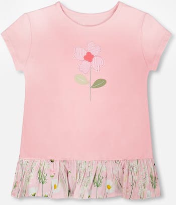 Our organic cotton bi-material tunic with ruffle dusty pink is a charming choice for a playful look. This long top combines a soft jersey tee with short sleeves and a flower chest print, finished with a lightweight woven ruffle hem in a delicate floral pattern. Designed in a blend of organic cotton, viscose, and cotton, it brings together comfort and airy elegance.