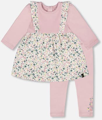 A charming blend of textures, our Organic Cotton Bi-Material Tunic and Leggings Set Neutral Purple is as stylish as it is comfy. The soft dress tunic features delicate ruffles at the shoulders and a skirt with an allover floral print and a flowing A-line cut, creating a graceful silhouette. Paired with stretchy interlock leggings, accented with a floral detail at the bottom of the left leg, this cozy outfit is perfect for playdates, strolls, and everyday adventures.
