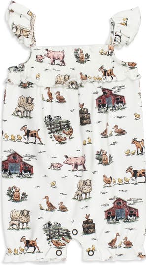 A smocked bodice provides shaping in a supersoft organic-cotton romper that's finished with ruffles at the shoulders for a sweet sunny-day look.