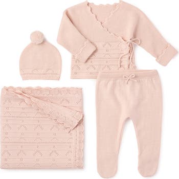 Your new bundle will be ready for the world in this cashmere-kissed, organic-cotton sweater set featuring a matching pointelle wrap top, pants, hat and blanket. Scalloped, hand-crocheted trim edges the neckline and cuffs.