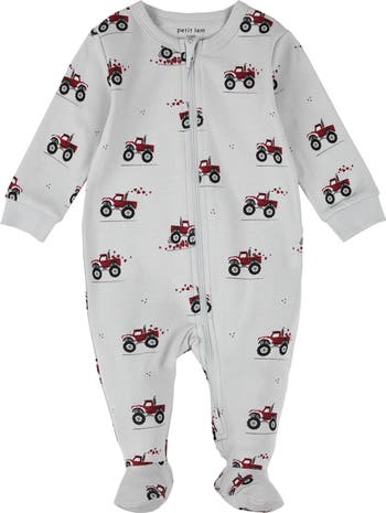 Love-fueled trucks pattern these footed pajamas made from breathable organic cotton and secured with a two-way front zip to make changing a breeze.