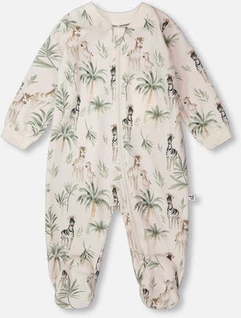The organic cotton jersey one-piece pyjama beige with zebra print is designed to keep baby boys snug through day and night. This soft footed sleeper features long sleeves, a round neckline, and a full-length zipper for quick and easy dressing. Made from breathable organic cotton with a touch of stretch, it ensures comfort and freedom of movement. Perfect for bedtime, playtime, or relaxed moments at home, it combines practicality with playful charm. A cozy piece from our "Under The Baobab" collection to brighten up the season.