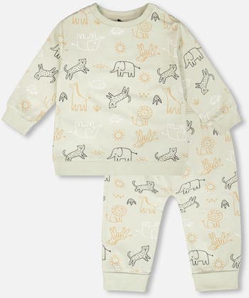 Wild animal friends turn the organic cotton jersey sweater and pants set sage green with animal print into an adventure-ready outfit for little boys. The long-sleeve top features a round neckline, shoulder snaps for easy dressing, and playful allover animal sketches. The matching pants come with cuffed ankles and an elastic waistband for comfort during play and rest. Made from soft organic cotton jersey with added stretch, this set is breathable, cozy, and perfect for everyday discoveries. A fun look from our "Under The Baobab" collection.