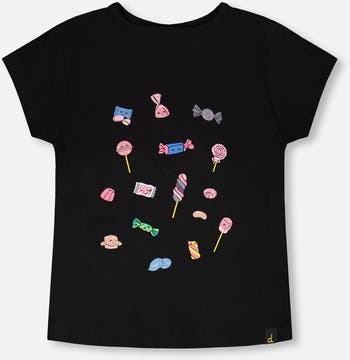 The organic cotton jersey t-shirt in black is both sweet and fun for everyday wear. This tee features a round neckline, short sleeves, and a playful candy print at the chest that adds a cheerful detail. Crafted from organic cotton with a touch of elastane, it ensures softness, breathability, and comfort, while being kind to the planet.