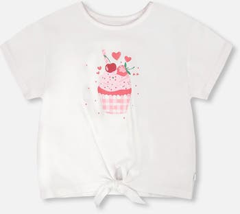 This organic cotton jersey t-shirt with tie at waist white is playful and sweet. This top features a round neckline, a cupcake print at the front, short sleeves, and a knotted tie detail that adds a fun finish. The organic cotton fabric with a hint of stretch makes it soft, breathable, and easy to wear, perfect for the “Cherry On The Check” collection.