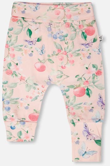 The organic cotton jersey evolutive pants pink with printed berries are designed to grow with her. Featuring a foldover waistband, an allover berry print and folded cuffs, this soft jersey piece offers a practical fit that adapts through growth spurts. The organic cotton blended with elastane ensures breathability, comfort, and gentle stretch for everyday wear. Perfect for playtime, naptime, or family outings, these pants combine function and sweetness. Ideal for pairing with any top from our "Blueberry Cuddles" collection for a coordinated seasonal look.